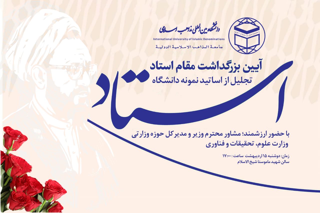مراسم بزرگداشت مقام والای استاد و گرامیداشت یاد و نام استاد شهید آیت مرتضی مطهری و تجلیل از استادان نمونه دانشگاه بین‌المللی مذاهب اسلامی برگزار می‌گردد.