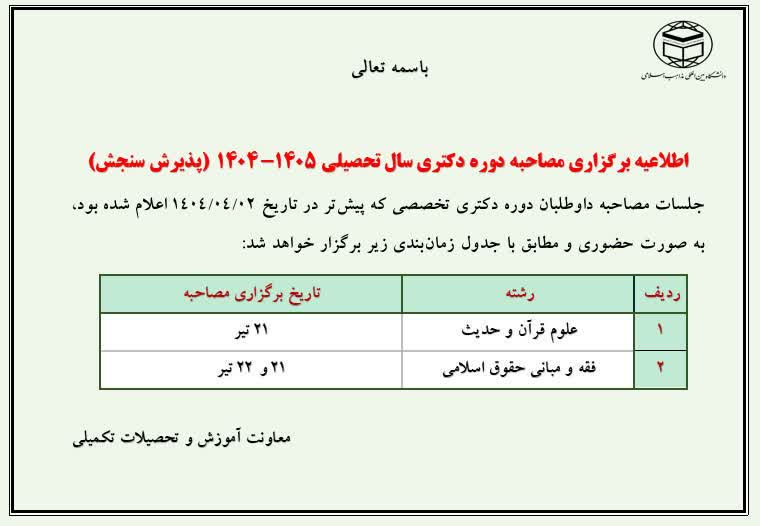 اطلاعیه برگزاری مصاحبه دوره دکتری پذیرش سنجش در رشتههای علوم قرآن و فقه و حقوق ۰۷ تیر ۱۴۰۴ | ۰۰:۲۱ کد : ۵۵۲ اطلاعیه ها تازه ترین اخبار تهران و شعب ارسال به دیگران نام شما ایمیل شما ایمیل دریافتکننده ارسال انصراف تعداد بازدید:۱۳۱۰