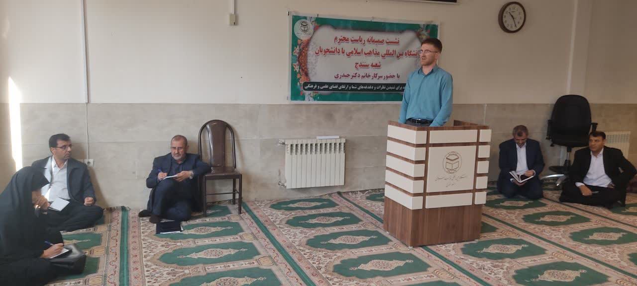 خانم دکتر حیدری معاون پشتیبانی و توسعه منابع دانشگاه مذاهب اسلامی نیز در این نشست بر تقویت خدمات رفاهی و خوابگاهی به دانشجویان این دانشگاه تأکید کرد و گفت: رئیس شعبه سنندج باید با نظارت دقیق بر کیفیت تغذیه و امکانات خوابگاهی جوابگوی دغدغه دانشجویان باشد و ما آمادگی داریم اعتبارات لازم برای امکانات ورزشی و فرهنگی دانشجویان را تأمین کنیم.